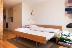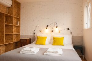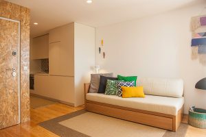 The house is about 55sqm and it’s in floor 2. It is equipped with a double bed in the bedroom and a sofa with two single beds in the living room, a bathroom and kitchen fully equipped. Ideal for 2 or 4 people. In the living room you can enjoy a little balcony with river views.