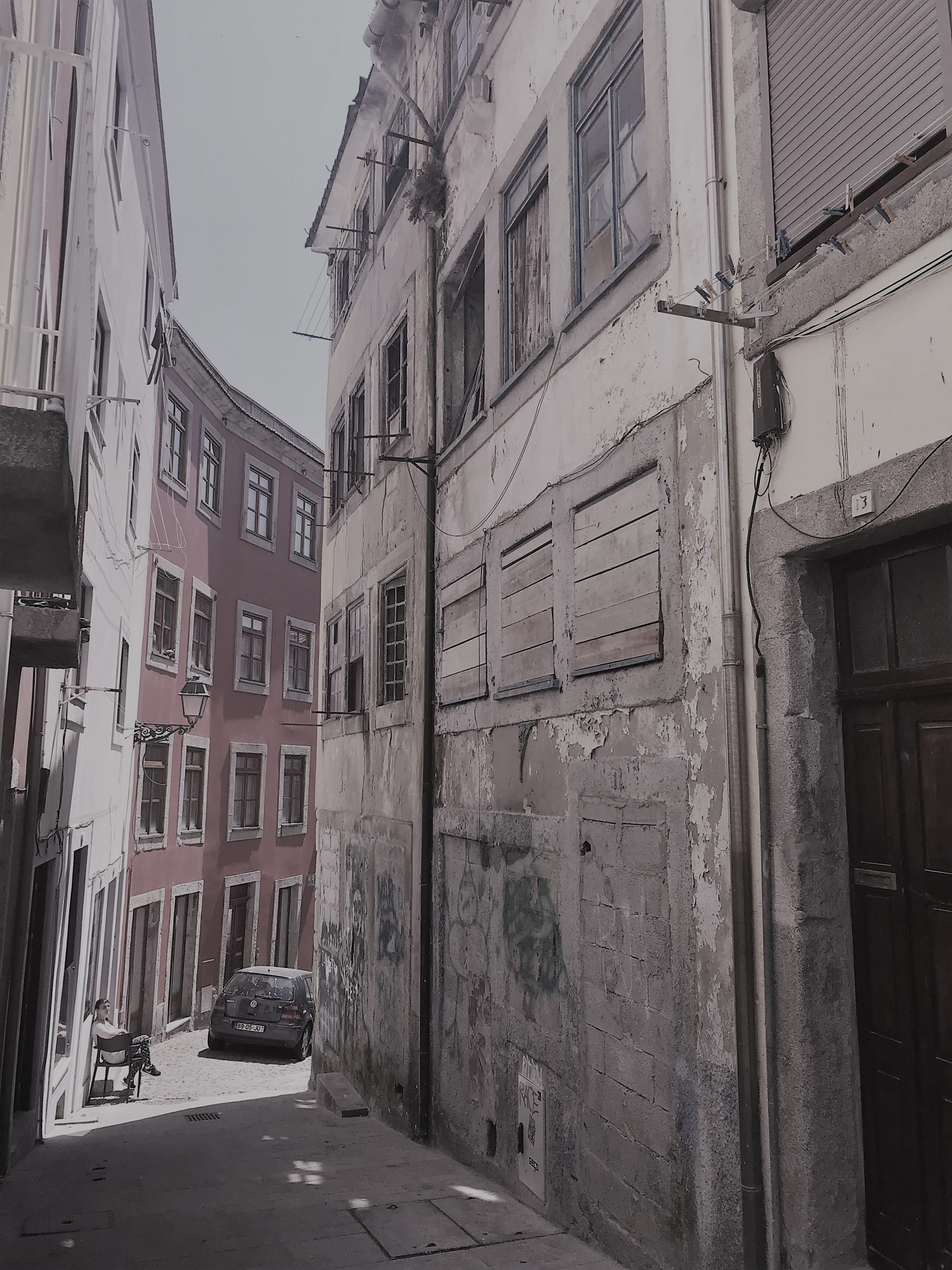 The 3 buildings have groundfloor + 4 floors, one of which is further back. The ground floor, facing Rua do Souto, is buried in relation to the entrance level through Rua dos Pelames.